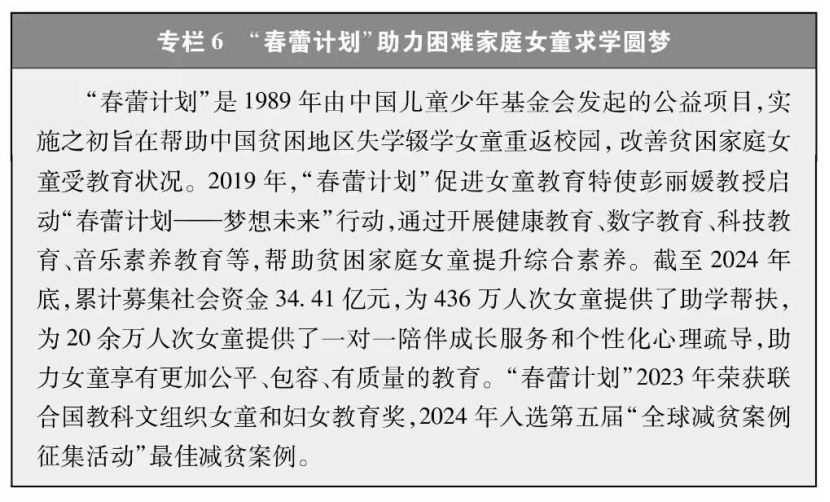 相关领域专项规划回应妇女发展现实需求。“健康中国2030”规划纲要、教育强国建设规划纲要,以及“十四五”就业促进规划、“十四五”民政事业发展规划等民生领域专项规划中,专门就提高妇幼健康水平、保障妇女平等受教育权利、支持妇女就业创业和职业发展、健全农村留守妇女关爱服务体系等提出政策举措。国家中长期人才发展规划纲要对促进人才性别结构趋于合理、加强女性人才培养选拔等作出安排,全民科学素质行动规划纲要对实施农村妇女素质提升计划等作出部署。四期国家人权行动计划均设立“妇女权益”专节,以专门措施保障妇女人身、财产、教育、就业、健康等各项权益。