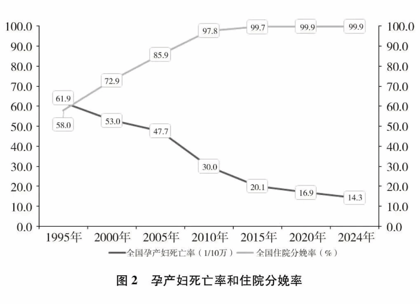 妇女健康水平大幅提高。2020年,妇女平均预期寿命已提高到80.9岁。2012年以来,全国住院分娩率持续稳定在99%以上,孕产妇系统管理率2024年达到94.9%,孕产妇死亡率从1995年的61.9/10万降至2024年的14.3/10万,下降了76.9%,远低于世界平均水平。中国妇幼健康核心指标(孕产妇死亡率、婴儿死亡率、5岁以下儿童死亡率)位居全球中高收入国家前列,提前实现联合国2030年可持续发展议程相关目标,被世界卫生组织列为妇幼健康高绩效的10个国家之一。