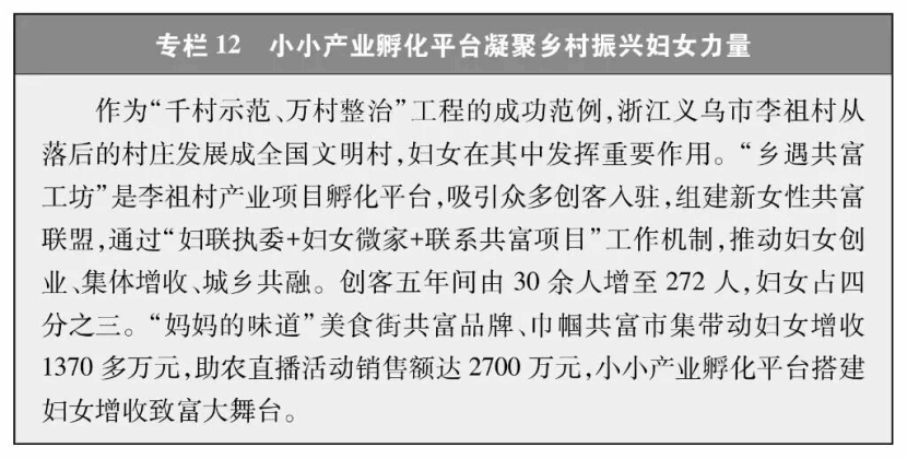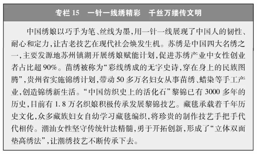 发展生产助力妇女就业增收。坚持开发式扶贫方针,赋能贫困妇女发展。加强产业扶持,推进食品加工、服装制造等劳动密集型产业梯度转移,产业帮扶政策覆盖98.9%的贫困户,通过东西部劳务协作、建立扶贫车间、开发乡村公益性岗位等,为有劳动能力和意愿的贫困妇女提供工作机会;鼓励支持电商扶贫、光伏扶贫、旅游扶贫等新业态新产业发展,帮助贫困妇女实现家门口就业;发展民族地区手工编织产业,让“苗绣”“彝绣”等订单式手工编织从“指尖技艺”转化为“指尖经济”。加强财政和金融支持,脱贫攻坚期间,出台专门政策提供免抵押免担保的贴息贷款、税费减免等支持,累计为妇女发放小额担保贷款和扶贫小额信贷4500多亿元,870万名妇女实现创业增收;2021-2024年,192.8万名妇女持续获得脱贫人口小额信贷768.3亿元。加强能力培训,开展多渠道、多层次、多形式的职业技能培训、创业培训和农业实用技术培训,截至2020年,累计对1021万名贫困妇女和妇女骨干进行各类技能培训;2023-2024年,“雨露计划”共资助63.2万名妇女接受职业教育,妇女发展内生动力持续激发。