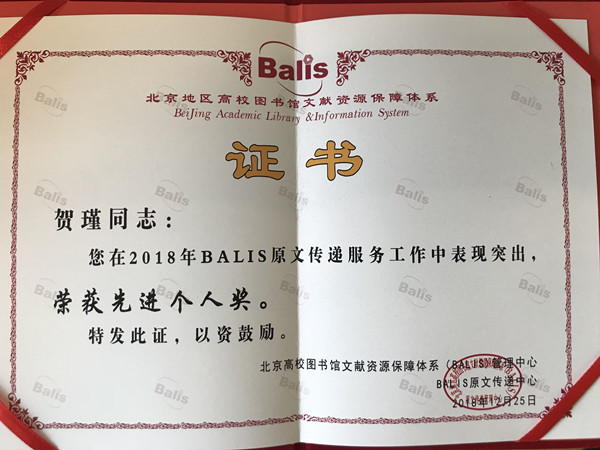 在北京地区90余家参评图书馆中,我校图书馆综合排名第23位,并且继2017年后再次荣获“BALIS原文传递最佳宣传奖”,贺瑾馆员获得“BALIS原文传递先进个人奖”。