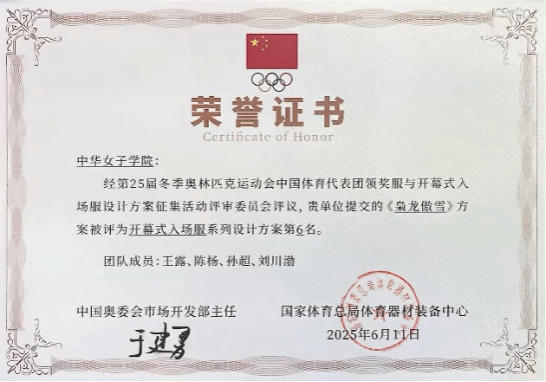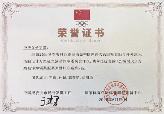 第25届冬季奥林匹克运动会将于2026年2月在意大利米兰和科尔蒂纳丹佩佐盛大举办。在由中国奥林匹克委员会主办的“第25届冬季奥林匹克运动会中国体育代表团领奖服与开幕式入场服设计方案征集活动”中,中华女子学院文化传播与艺术学院设计团队脱颖而出,凭借出色的创意与专业表现,荣获开幕式入场服设计第6名、领奖服设计第5名的佳绩!此次活动吸引了清华大学、中央美术学院等顶尖院校及知名企业参与,共收到75套入围作品,我院设计成果跻身全国前十,充分展现了团队的专业实力与创新精神。