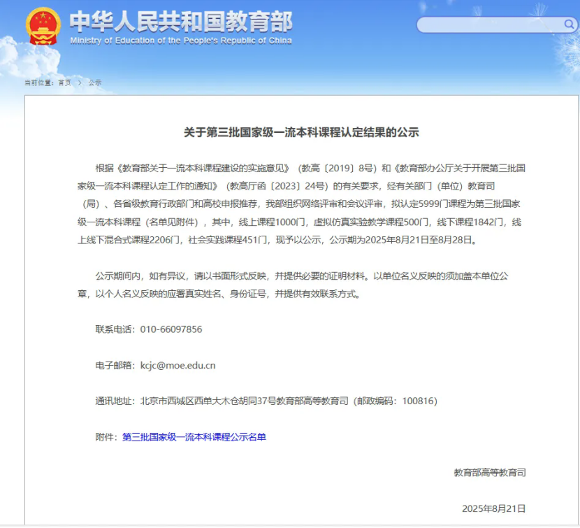 8月21日,教育部正式公示第三批国家级一流本科课程认定结果,我校《艺术语言吐字与发声1》《功能性服装设计》2门课程获评线下一流课程,实现了我校在该类别国家级一流课程“零的突破”。
