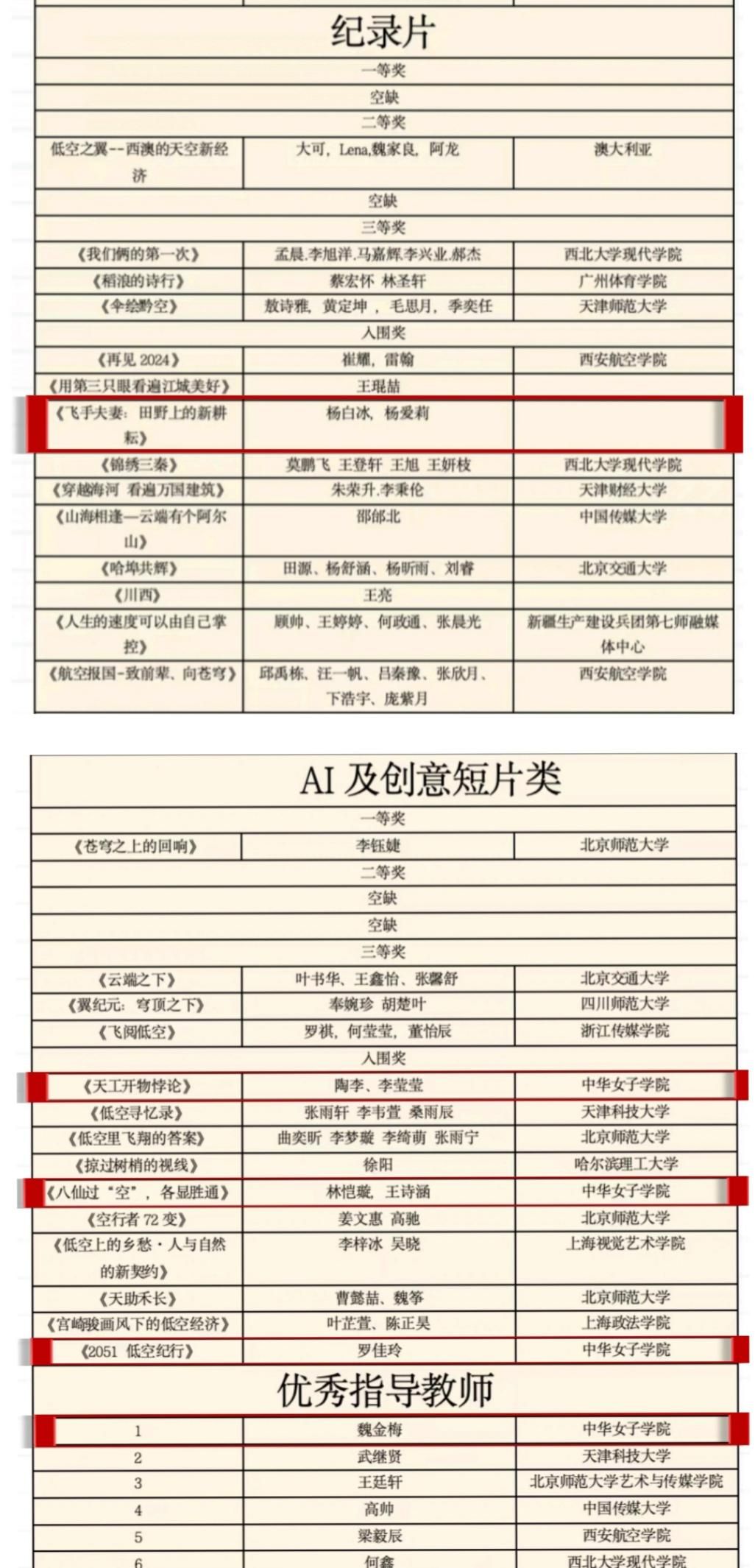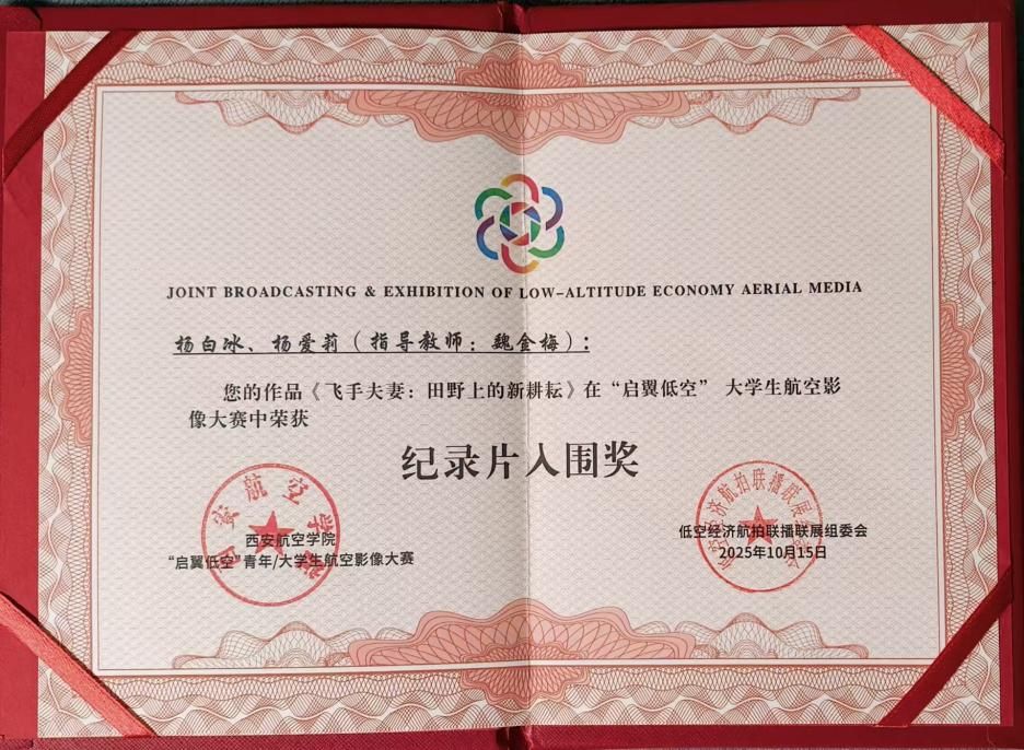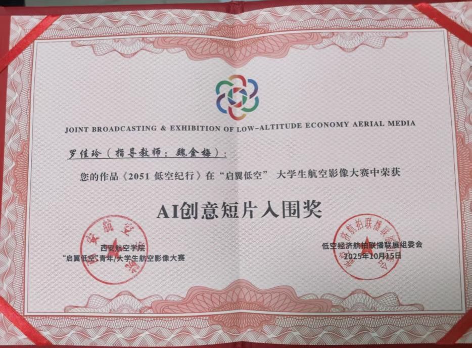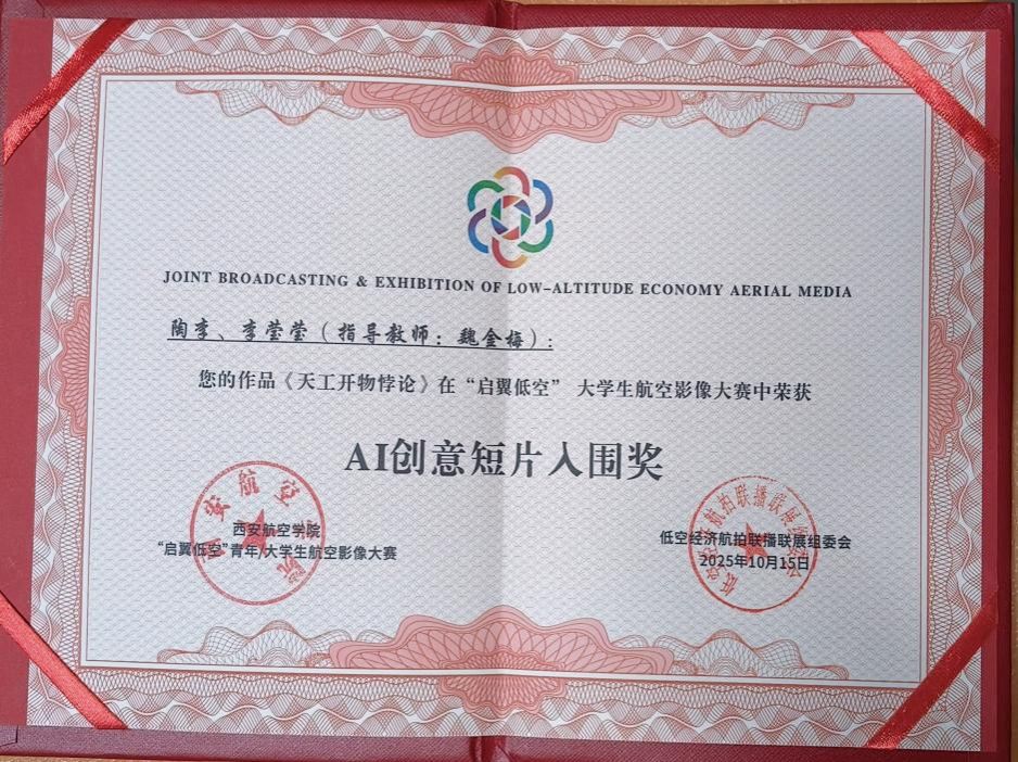 本次大赛由中国广播电视社会组织联合会、中国行业报协会与西安航空学院联合主办,以“用镜头描绘祖国低空经济发展的美好”为主题,设立纪录片、剧情片、AI及创意短片三大赛道。在全国300余件参赛作品中,我校学生作品脱颖而出,4组同学获大赛提名,4组同学获入围奖(其中纪录片赛道1组、AI赛道3组),入围作品未来将在百家主流媒体平台进行联播联展。指导老师魏金梅荣获“优秀指导教师”称号。