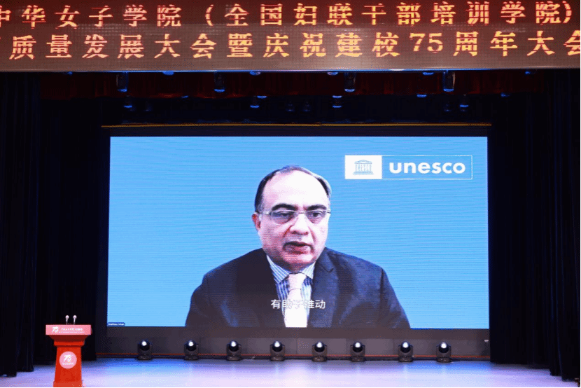 联合国教科文组织东亚多部门地区办事处主任、驻华代表夏泽翰送上视频祝福。他认为,中华女子学院在过去的75年中发展高质量教育和推动性别平等的举措出类拔萃,令人称道;学校不断培养优秀的人才,激励着各行各业一代又一代的女性领导者。他高度评价中华女子学院与联合国教科文组织携手合作共同主持的联合国教科文组织“媒介与女性”教席,发挥了重要的全球影响力。希望中华女子学院再接再厉,不断激发未来女性领导者的智慧与力量。