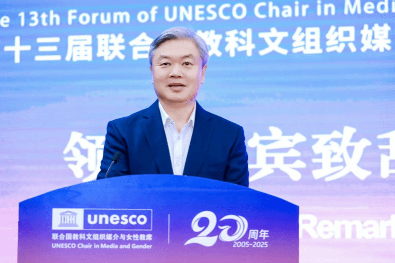 中国常驻联合国教科文组织代表团大使衔代表杨新育在致辞中向教席成立二十周年表示祝贺。她指出,教席成立以来,在推动性别平等和妇女赋能方面取得了卓越成就。此次论坛以“推动女性在AI时代的全面发展”为主题,顺应数字技术浪潮,为女性赋能,促进科技创新和社会治理中女性的广泛参与。她希望,联合国教科文组织媒介与女性教席不负使命,继续以知识启迪智慧,以教育赋能未来,努力推动性别平等与人类文明进步的征程。