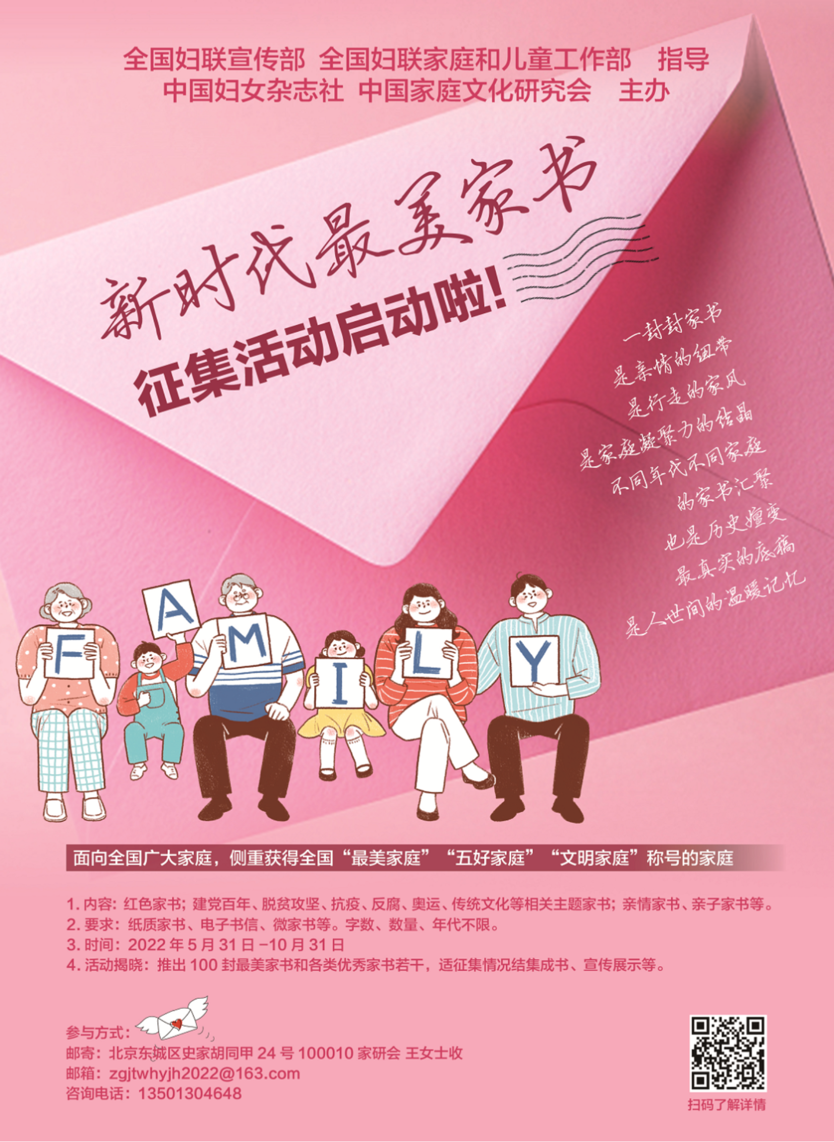 为深入贯彻习近平总书记关于注重家庭家教家风建设重要论述精神,弘扬新时代家庭观,传承家书文化,推动形成爱国爱家、相亲相爱、向上向善、共建共享的社会主义家庭文明新风尚,大力营造迎接宣传贯彻党的二十大的浓厚氛围,由全国妇联宣传部、全国妇联家庭和儿童工作部指导,中国妇女杂志社与中国家庭文化研究会共同主办新时代最美家书征集活动。