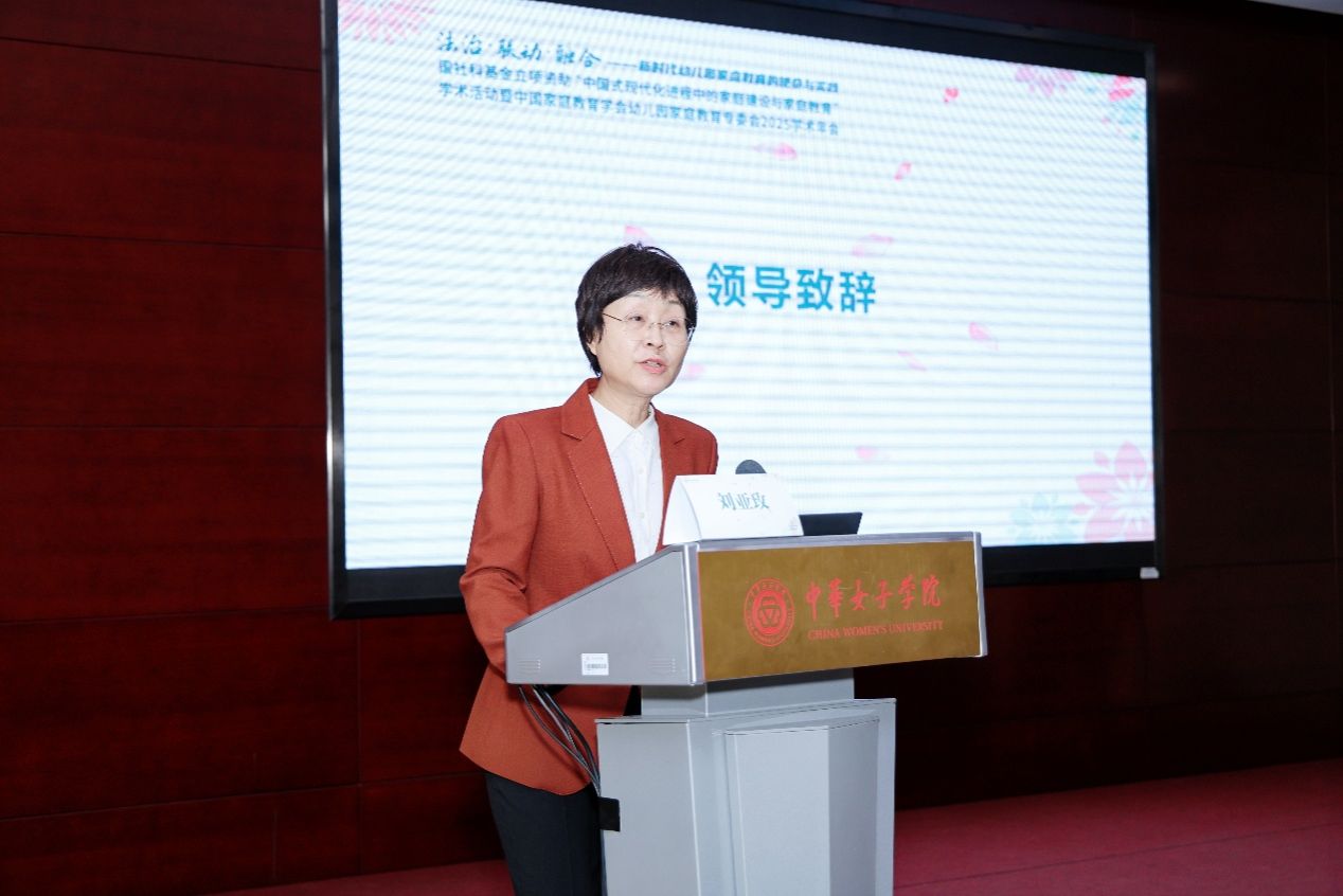 刘亚玫代表中华女子学院向莅临会议的嘉宾表示热烈欢迎,并向长期支持学校发展的同仁和朋友们表示衷心感谢。她指出,党的十八大以来,习近平总书记高度重视家庭、家教、家风建设,形成了系统完整的家庭教育思想,为理解家庭教育提供了根本遵循。今年是《学前教育法》正式实施的开局之年,在全国上下深入学习贯彻党的二十届四中全会精神之际,本次年会以“法治·联动·融合”为主题,既是学术盛会,更是推动家庭教育高质量发展的思想会、动员会和行动会。中华女子学院作为全国妇联直属的高等学府,未来期待与各界携手共同推动家庭教育高质量发展。